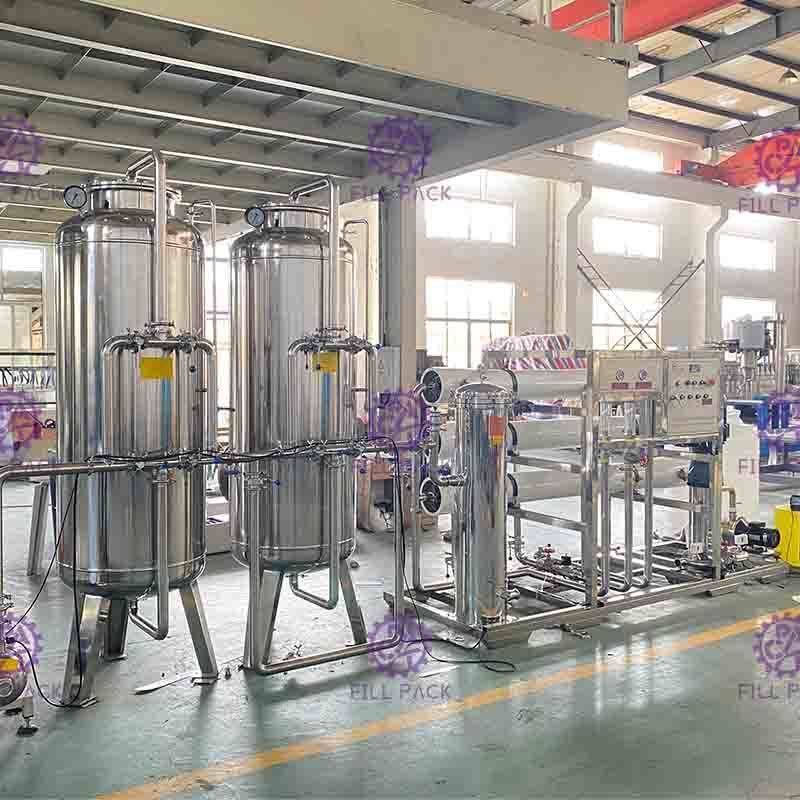 Réservoir d'eau brute ---- Pompe à eau brute---- Filtre à sable de quartz ---- Filtre à charbon actif---- Échangeur d'ions ---- Filtre de précision ---- Réservoir tampon d'eau ---- Système RO avec baril d'eau salée ---- Stérilisateur UV ---- Réservoir de stockage d'eau pure